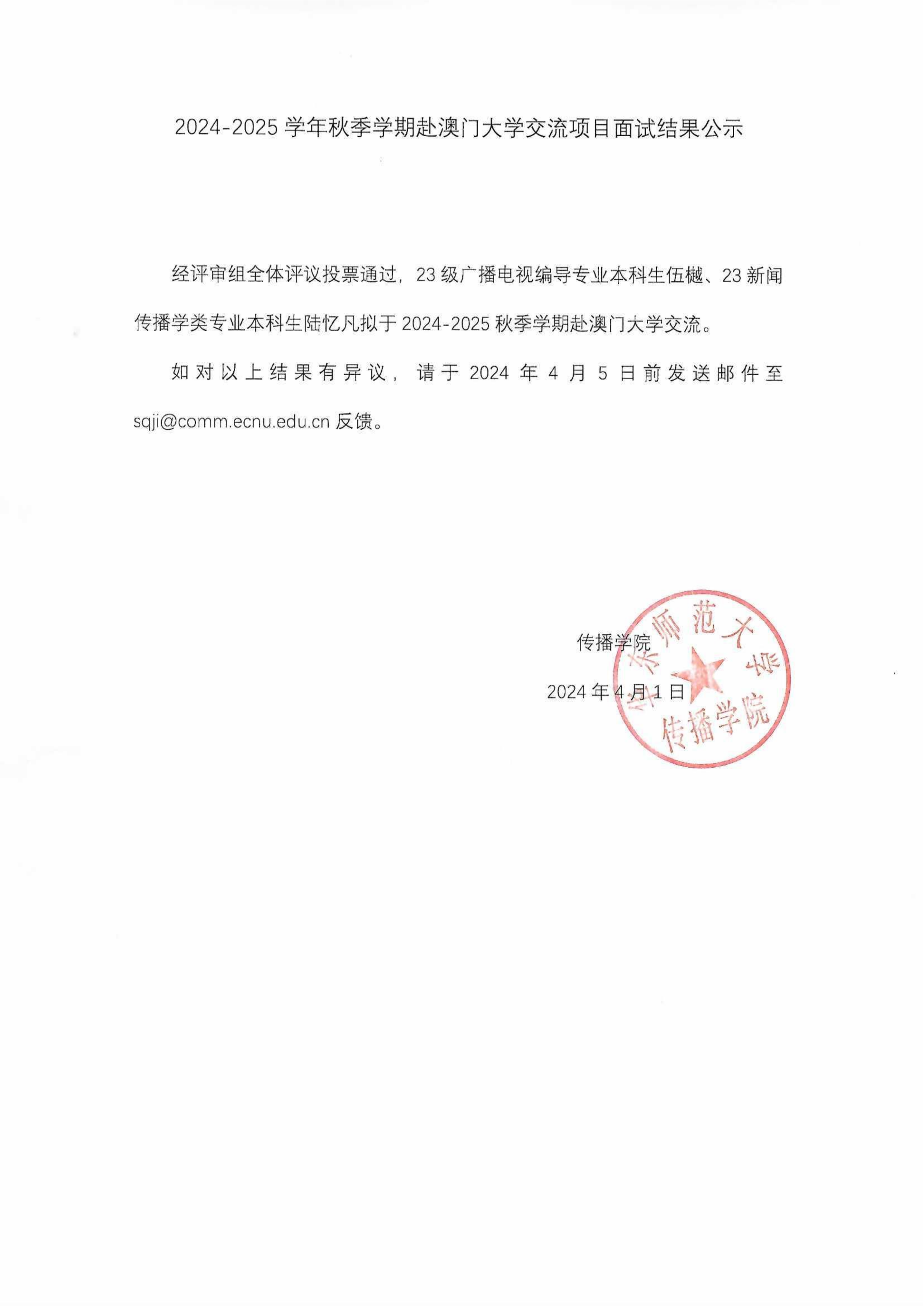 2024-2025学年秋季学期赴澳门大学交流项目面试结果公示