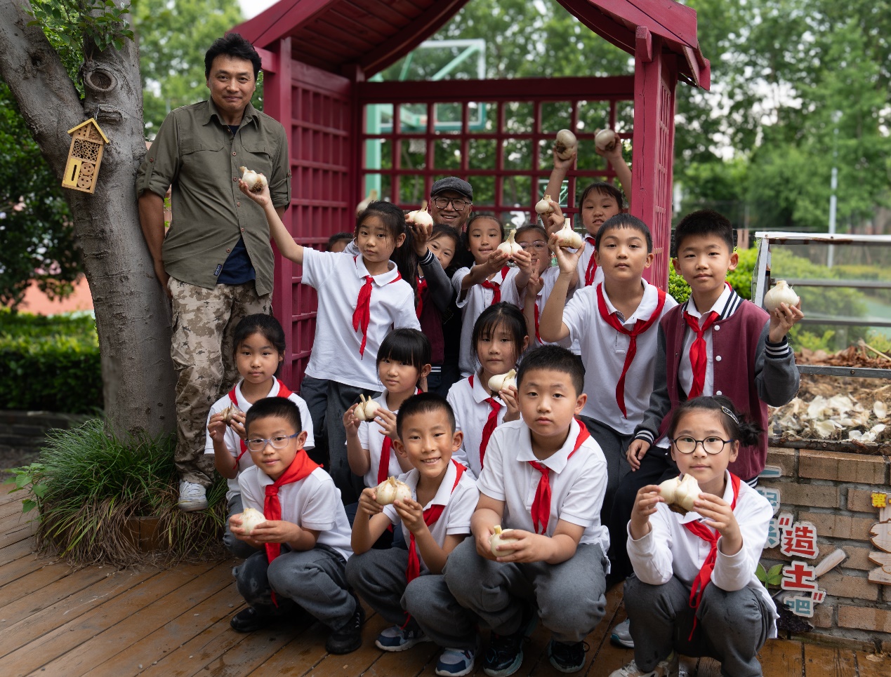 2025年5月28日15:00,程融早早坐在了闵行田园第二外国语实验小学的花圃旁,等着学生们来上课。半小时后,学生们簇拥在他的身边。