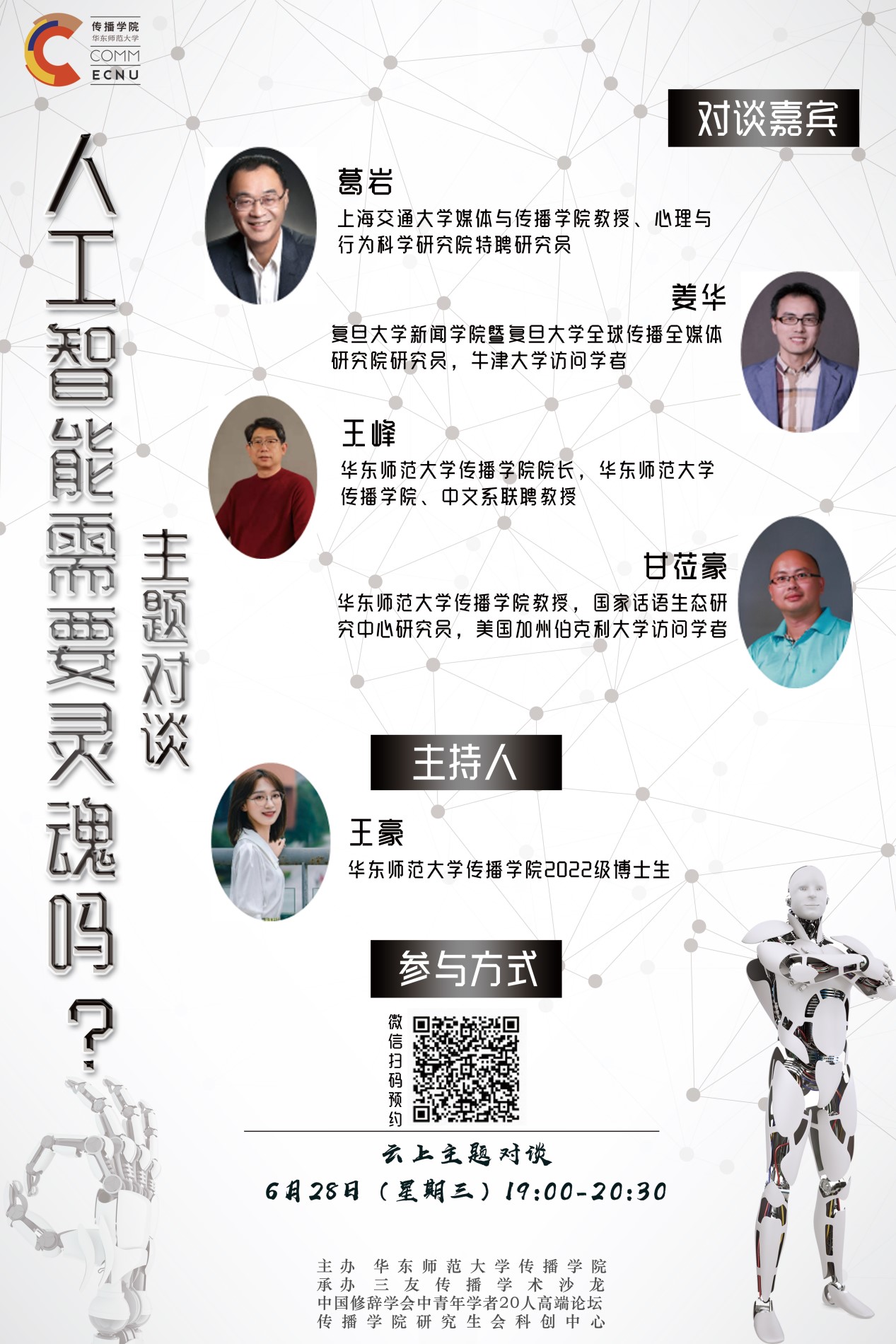 人工智能的迅速发展激起了人们对新技术与未来人机协同社会的多重想象和忧虑,由此生发的关于人工智能会否有意识或灵魂、是否需要有灵魂等问题,也引起了激烈讨论。本次对谈将回到人工智能、灵魂与需要问题的概念丛中,从如何理解人工智能作为一种智能形式、如何理解当代灵魂问题的内涵与外延,以及如何理解“需要”及其背后折射出的心态,逐层展开对话,重新对于这一问题进行厘清与探索。这将有助于人类恰切定位人工智能的层次与位置,同时面向未来以建立一种新的人机关系与人机交往秩序,在持有健康的人工智能观念下,更好发挥人机协同效应促进社会发展。