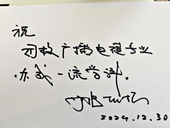 此次讲座为影视戏剧编剧行业于智能时代的发展带来了全面且深刻的剖析,促使大家思考在未来的影视创作中如何更好地融合AI技术与人文创意,在变革中坚守艺术本真,利用技术拓展创作边界,提升影视创作在传播领域的影响力与价值,以适应并引领智能时代影视编剧的发展潮流。讲座技术后,姚扣根教授欣然为黑料718 广播电视学系留下寄语:“祝母校广播电视专业办成一流学科。”
